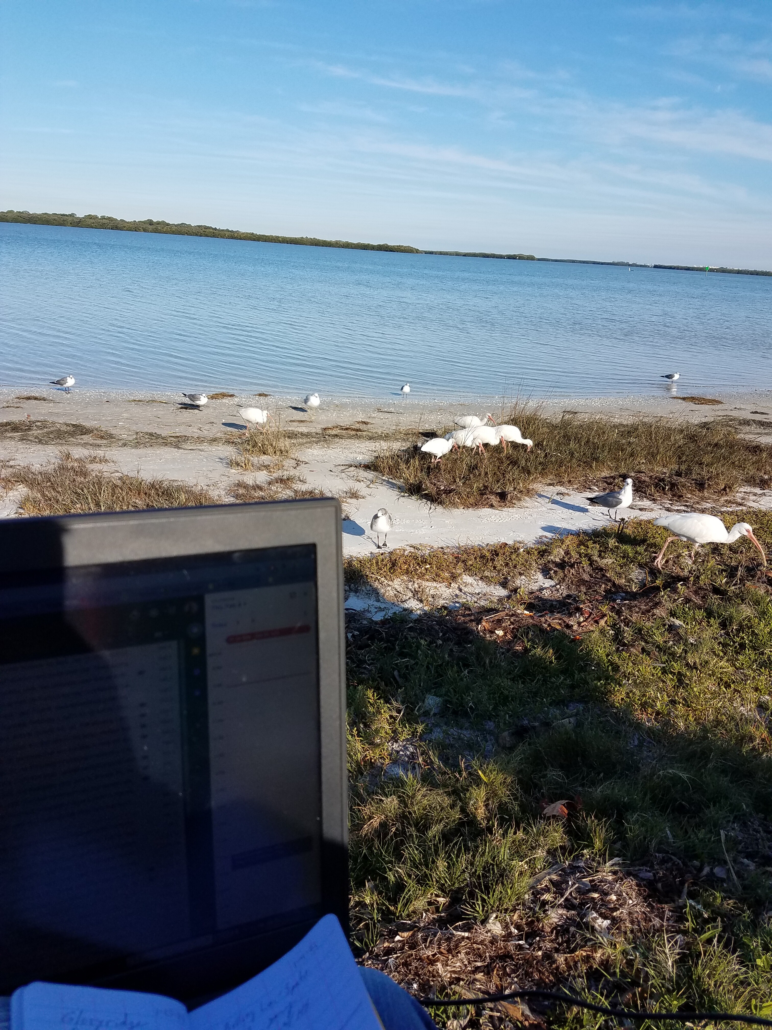 H took a picture of his “office” this morning. We had 13 white pelicans, uncountable numbers of brown pelicans, blue, white, and snowy egrets, blue and white herons, about a dozen osprey, willets, gulls of various types, diving ducks, cormorants, ibises, and oodles of small shorebirds. It was impossible to catch them all in a photo, but it’s superb in person. We’re still waiting on the dolphins.