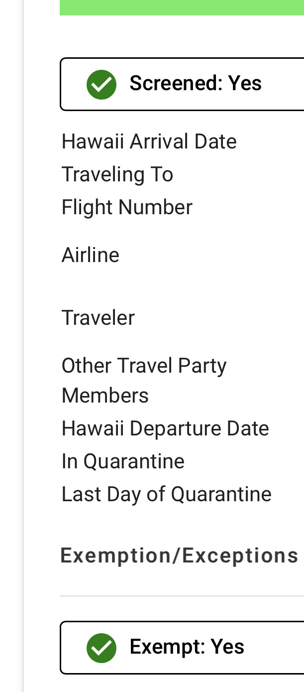 The “exempt” will be green as soon as either the test results or vaxx card is uploaded and accepted by the system. The “screened” will be green after either manual screening or, if you have already traveled to Hawaii with a vaxx exemption, it will turn green 12 or so hours before the flight. You will need both green check marks and a wristband to bypass arrival screening. Some hotels will want to see both green check marks to let you check into your room. Restaurants will ask for your id and vaxx card. Each island may have its own requirements though.