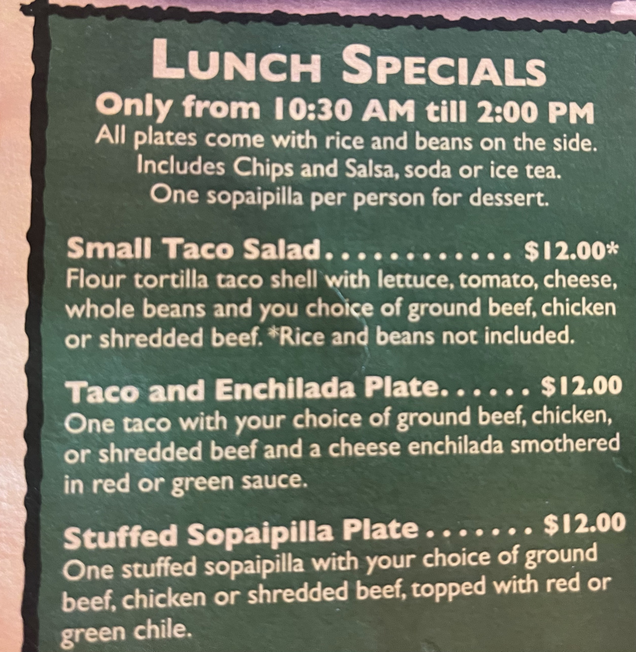 We tried a (new to us) Mexican restaurant for lunch today, and the lunch menu was all $12 meals (7 choices) that included chips and salsa, rice and beans on the side, entree, drink, and dessert!