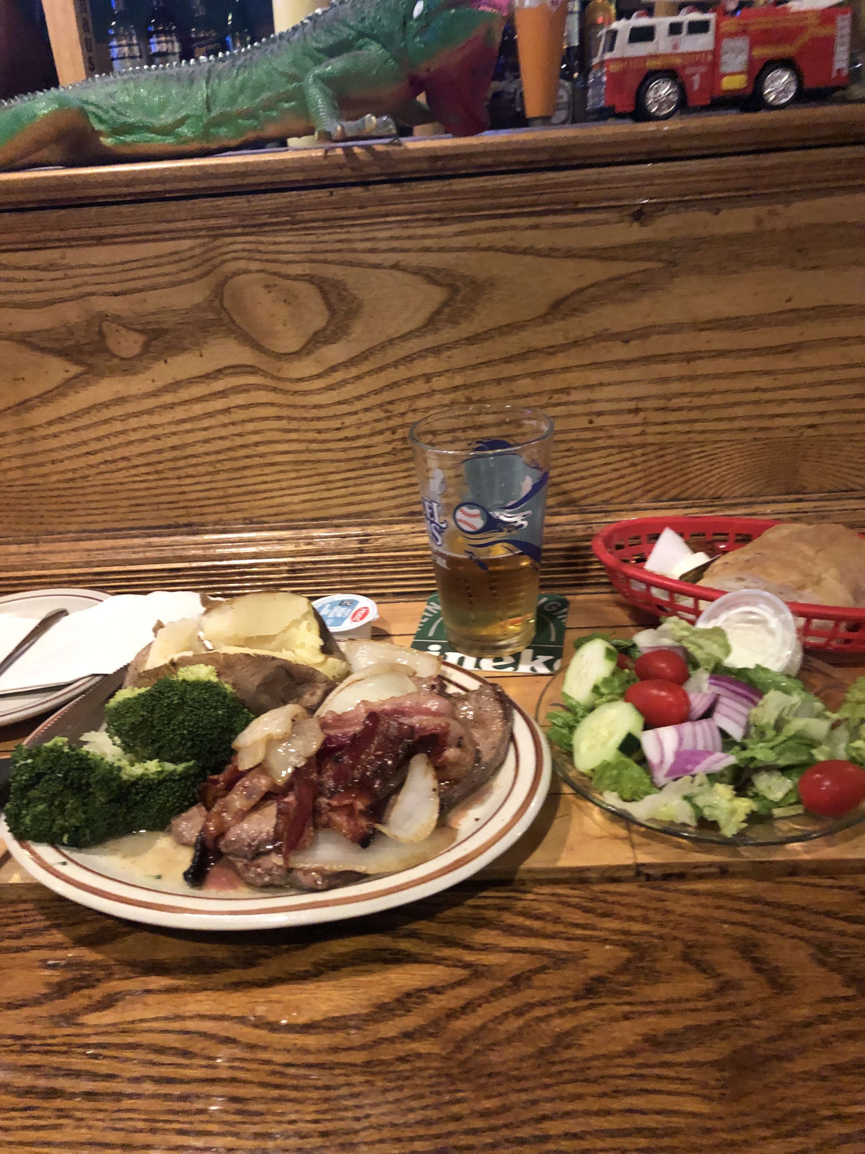 Okay I’m cheating by a dollar. I just ordered this $13. Liver and onions, 3 pieces of bacon on top. Baked potato, broccoli, salad and bread. Enough for 2 more lunches. @Mashinations, this is in Boston. Beer not included.![]()