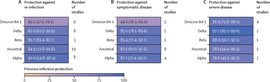Overall, protection from prior infection appears to be similar to that of vaccination (probably better compared to only having the primary doses of a vaccine against the ancestral virus), including the significantly lower level of protection against reinfection or symptomatic disease for Omicron compared to previous variants. Protection against severe disease was high even for Omicron. It was also noted that some of the studies included found protection against Omicron reinfection or symptomatic disease to be higher than the above if the prior infection was Omicron.