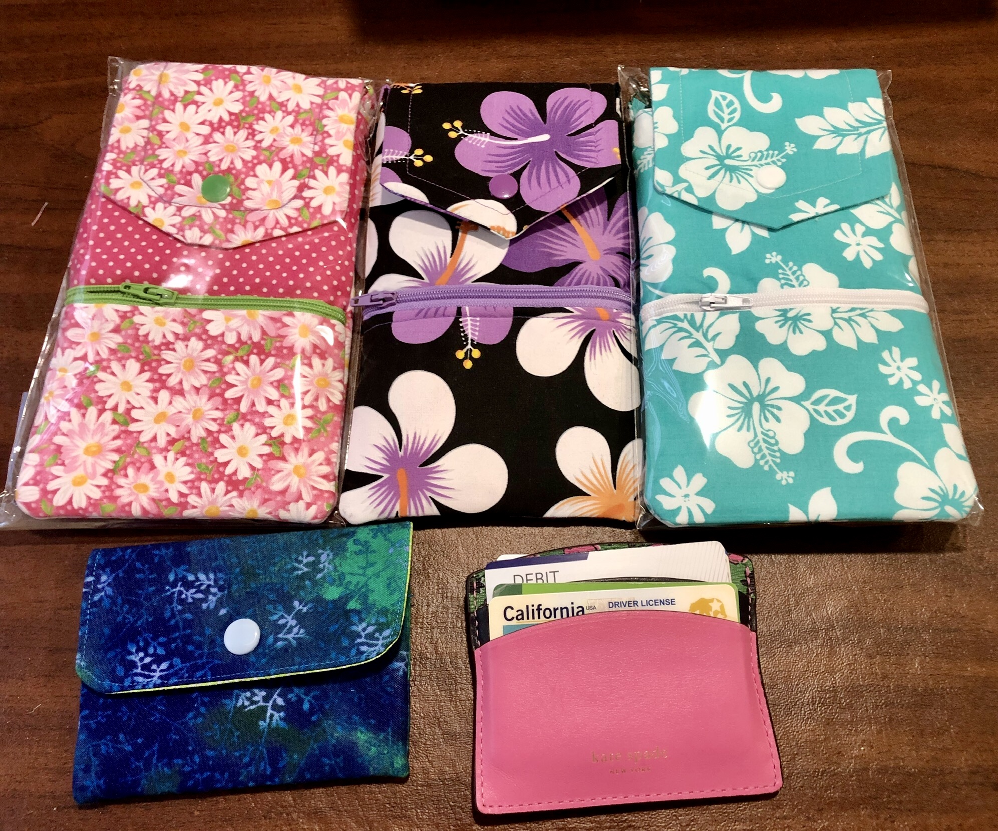 I haven’t used a full sized purse or “wallet” for well over 10 years. The bright flowered zip pouch is for cash and the blue zip pouch holds every card I need at any time (gift cards, Visa, medical, AAA, etc). My purse is a small crossbody and has a compartment for eye drops, mints, pen, chap stick, toothpick holder, tissues and probably crap I don’t need to drag around with me (but far less than I used to!). I buy new zip pouches that catch my attention when I travel. Nice souvenir and reminder of places I’ve been.