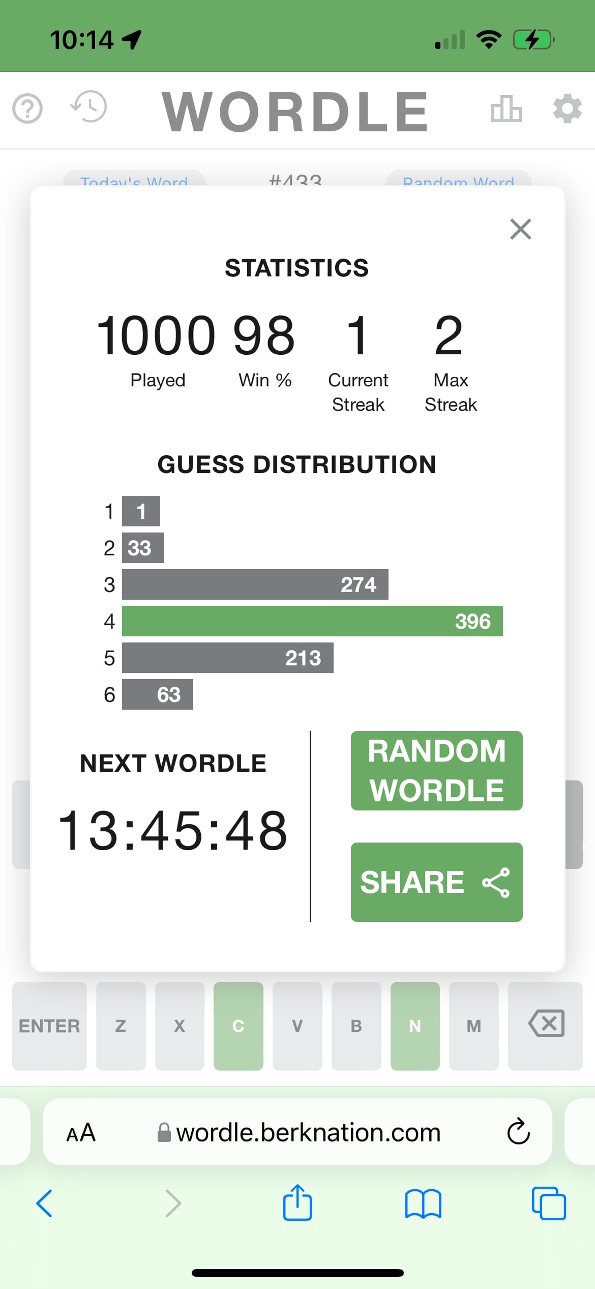 Got it in three today. Hard mode isn’t harder, IMO. Today’s word was too easy, but yesterday’s was a beast.
