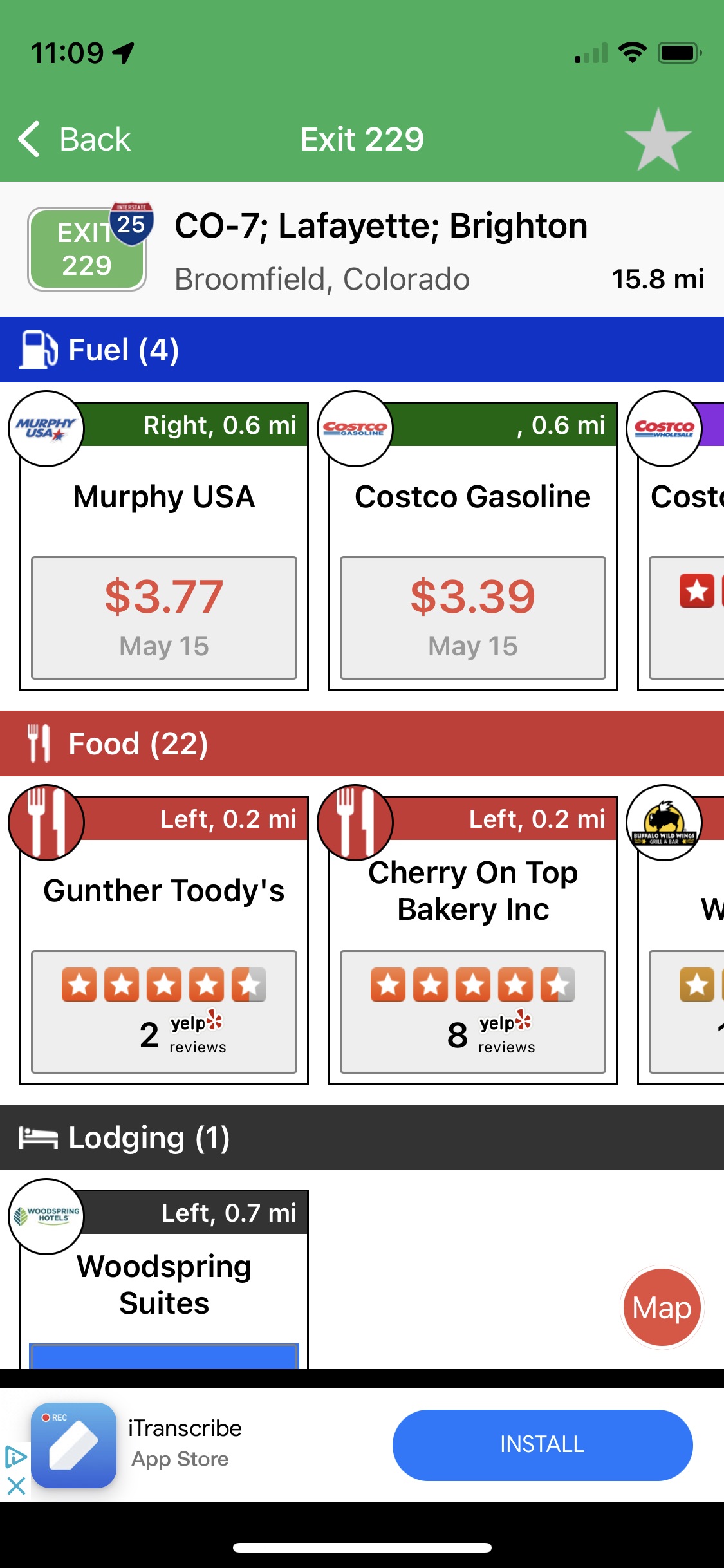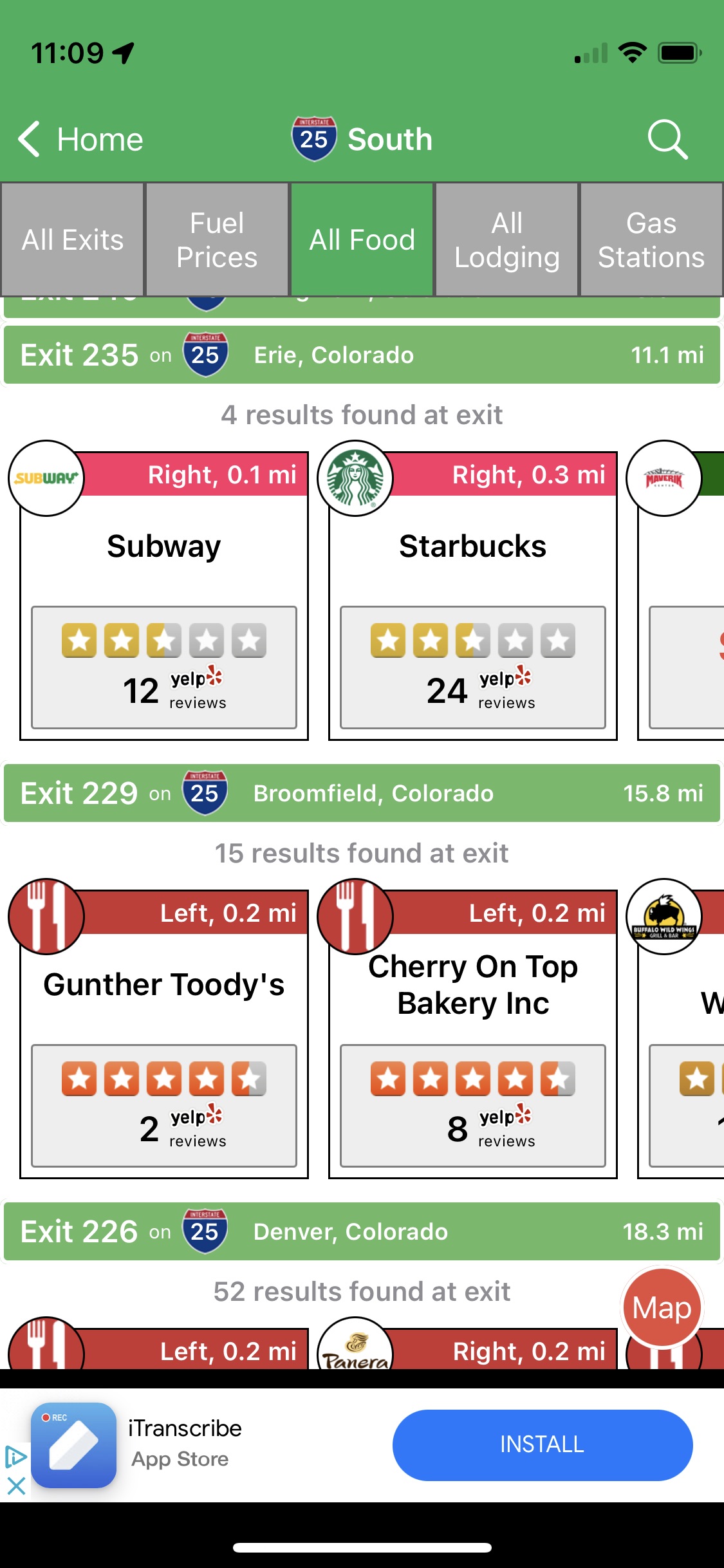 Mainly I use iExit to look 50 miles down the road, plot out our next food/gas stop. Ideally I find a food place my husband (the driver) likes close to the exit and in the same direction as a gas station he likes (he’s picky about using some of the lesser known brands).