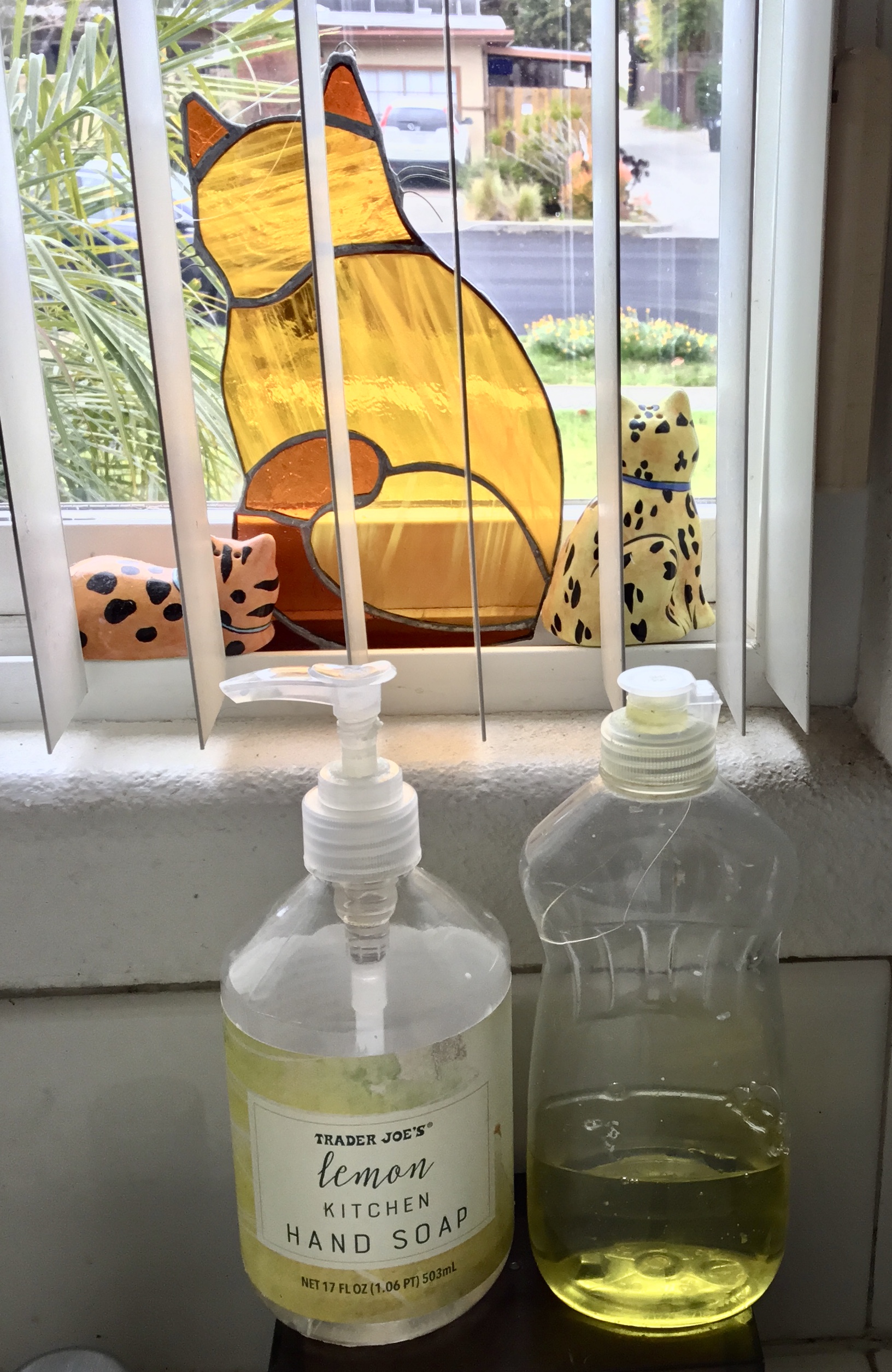 I will not judge you! We use that TJ lemon hand soap pump, and an old small Joy bottle that has the labels removed. They do coordinate with my kitchen window decor! If I ever find a small yellow cat soap dispenser without a stupid expression on the kittyās face, I would buy it.