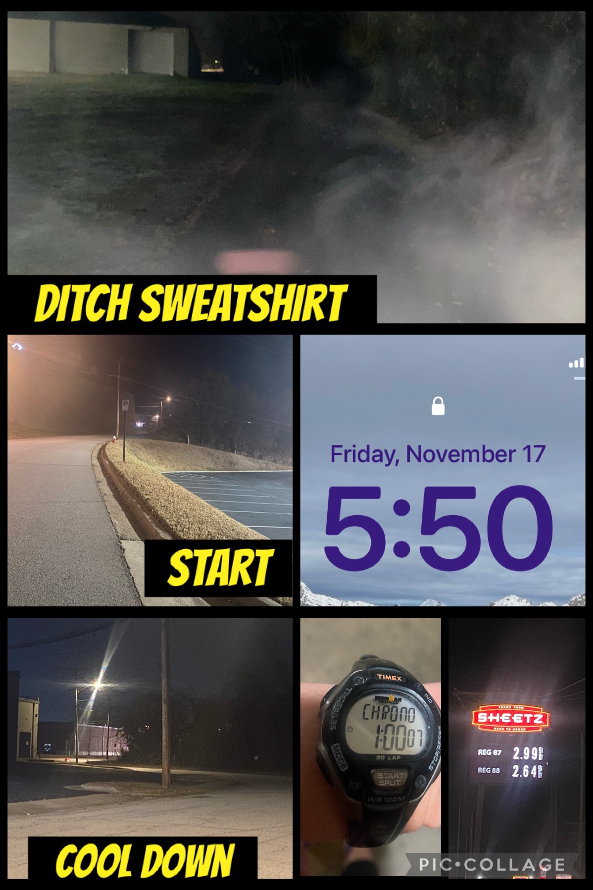 Here we go, though mine might have been more appropriate for Halloween. I got pictures of the beginning, about 10 min into the run when I ditched my sweatshirt and then at the cooldown. And then my favorite gas station pit stop place (which is also by the end).